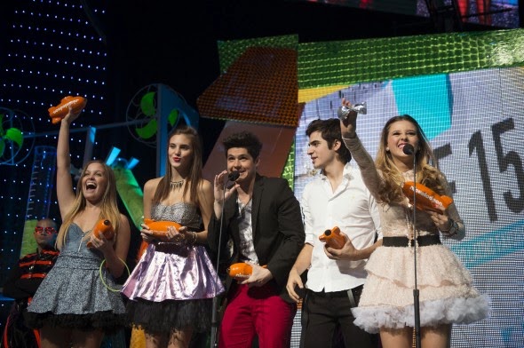Imágenes de Eleazar Gómez, Yago Muñoz, Jack Duarte, Paulina Goto, Macarena Achaga y Natasha Dupeyrón durante los Kids Choice Awards México 2012 en donde la telenovela Miss XV se convirtió en la gran ganadora al obtener 7 premios.